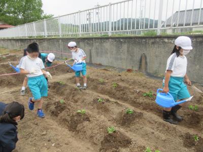 5月14日(木)学校の畑に野菜を植えました。例年は、農業委員さんに教えていただきながら子どもたちで植えるのですが、今年は休校中のため先生たちで植えました。みんなが元気に登校する頃には、大きく育っていることでしょう。