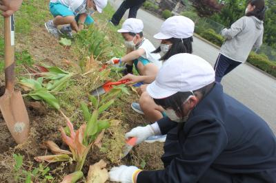 5月26日(火)、掃除の時間に全校で、校舎正面花壇のチューリップの球根抜きをしました。枯れた葉の周りの土をスコップで深く掘ると、球根がザクザクと出てきました。子どもたちは、「あ!ここにもあった!!」と、お宝探しを楽しむように一生懸命作業していました。みんなが大事に抜いた球根は、また来年の春に、色とりどりの花を咲かせて楽しませてくれることでしょう。