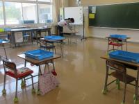 放課後、子どもたちが帰ると、先生たちで手分けをして、教室の椅子や机、ドアやロッカーの上、特別教室や玄関など、手で触った場所のアルコール消毒をしています。
