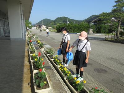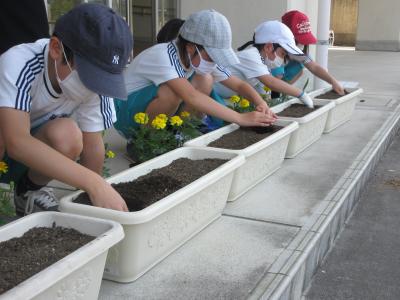 6月9日(火)全校で花の苗を植えました。今年度から1人ずつ1つのプランターを担当し、お世話をすることになりました。低学年は千日紅、中学年はマリーゴールド、高学年はサルビアです。児童玄関前に33個のプランターが並び、きれいな花を咲かせています。
