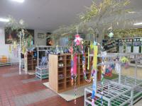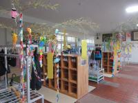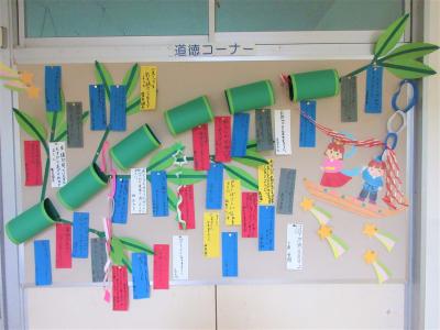 7月7日(火)朝から雨が降り続いていますが、今日は七夕の日です。若山小学校の児童玄関には、若山の山からとってきた笹の葉に、色とりどりの七夕飾りが飾られています。2階廊下の道徳コーナーにも、みんなの願い事が書かれた短冊が飾られています。