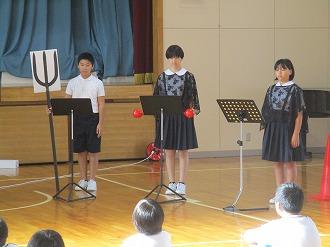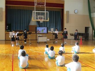 9月27日(金)、全校集会がありました。「手のひらを太陽に」をリズムにのって元気よくみんなで歌いました。また、保健委員会のお知らせもありました。「歯の大切さ」について知ってもらうために、口の中をアパート、虫歯菌をそのアパートに住む人に例えて、分かりやすく説明してくれました。自分の歯は自分で守るぞ!