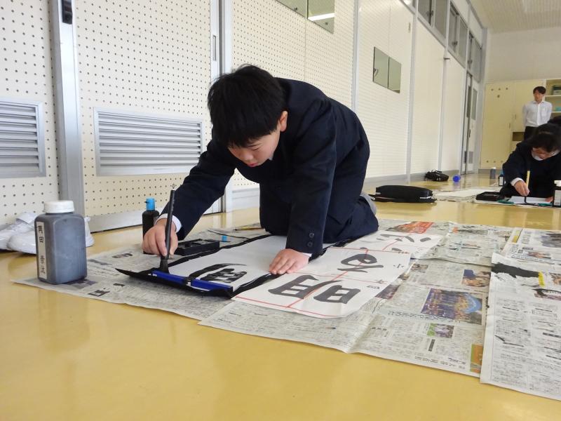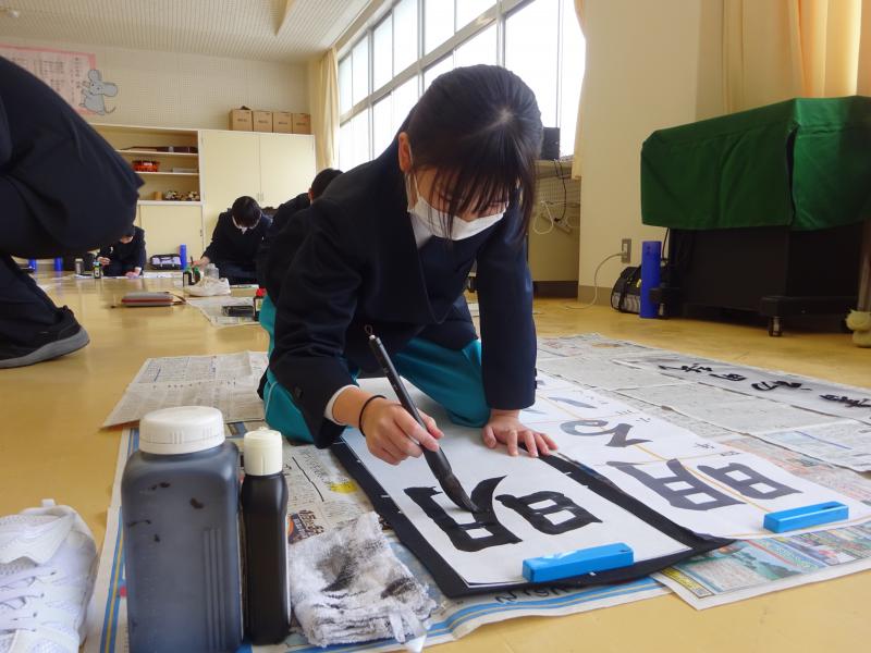 12月19日(木)、町の先生、中川秀邦さんにお越しいただき、書き初め教室が行われました。とめ・はね・はらいの指導をはじめ、丁寧に教えていただきました。「教えたことを素直に聞いて枚数を重ねるごとに、上手になっていきましたよ。」とおっしゃってくださいました。ありがとうございました。