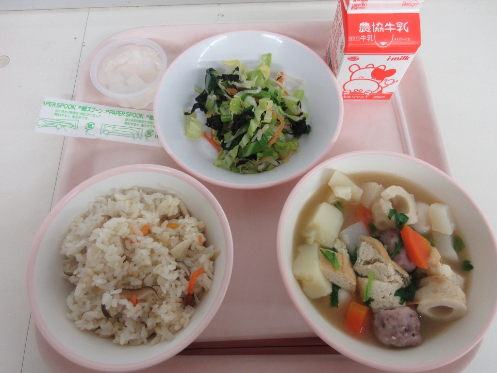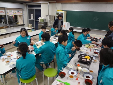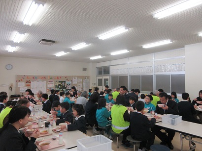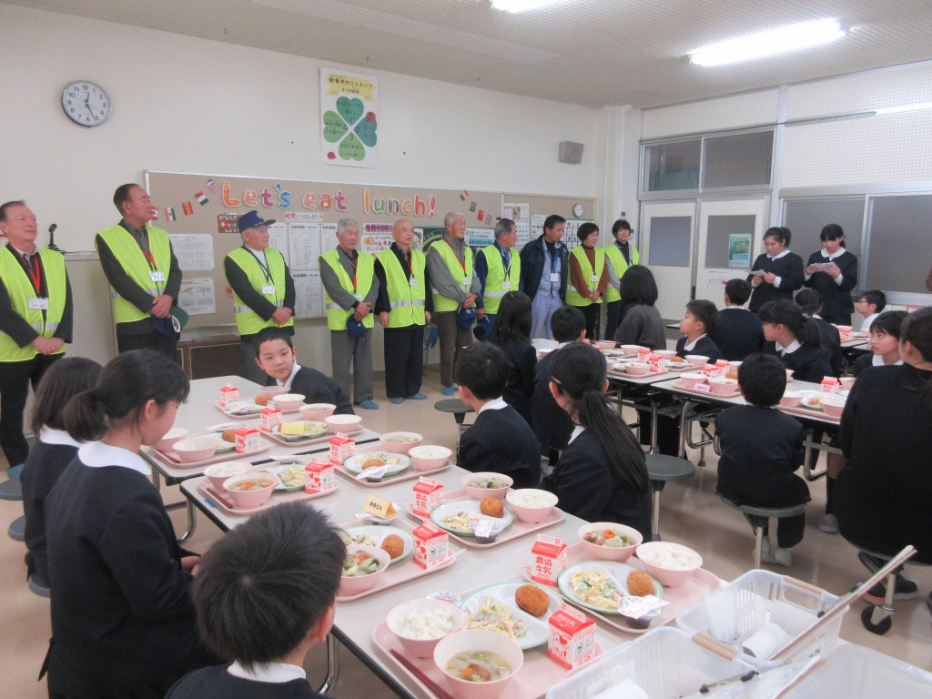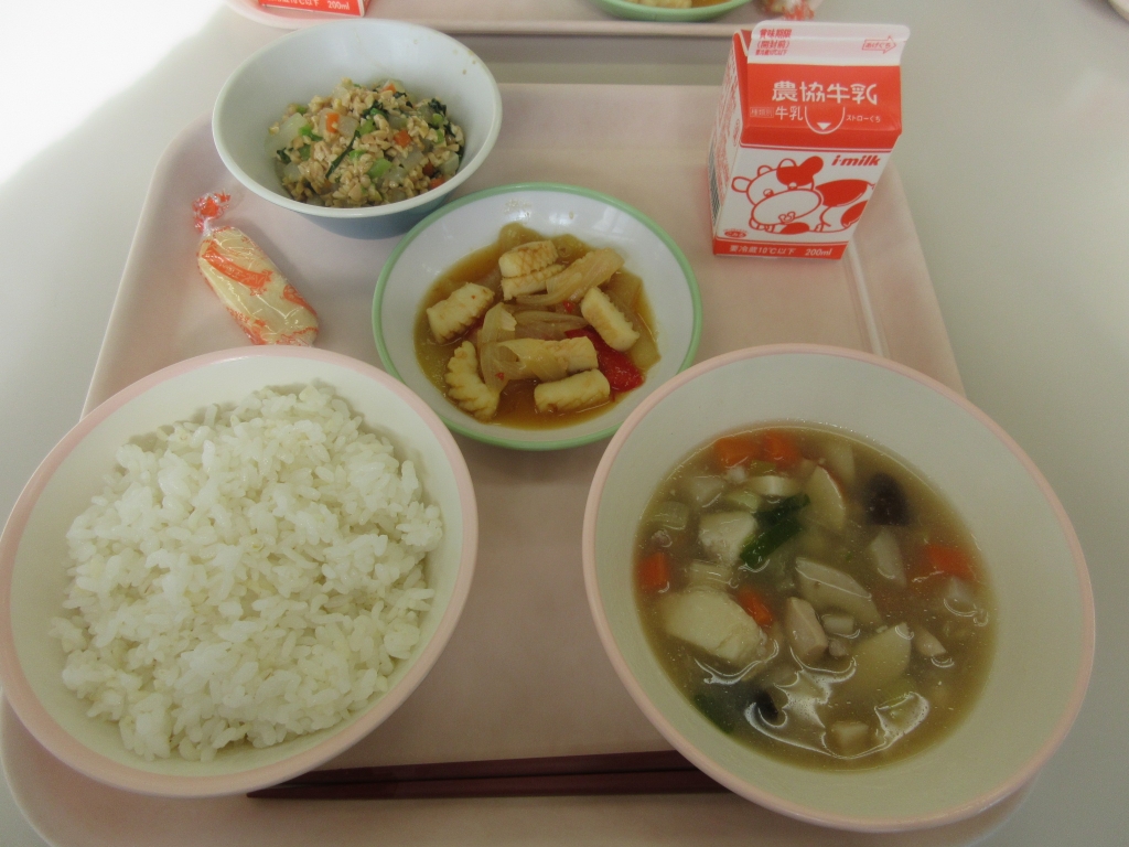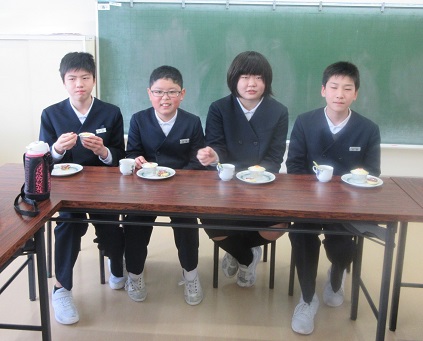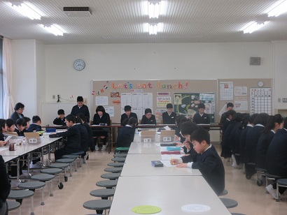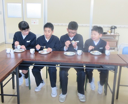 1月31日(金)全国学校給食週間最終日は,新潟県の献立が登場しました。唐辛子の発酵調味料を使った「いかのかんずり風炒め」,魚沼地方の郷土料理である「きりざい」,新潟県オリジナルの「のっぺい汁」,デザートには「ハッピーターン」がでました。給食にお菓子が出るのは新鮮だったため,子どもたちは楽しそうに食べていました。