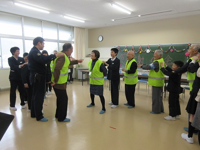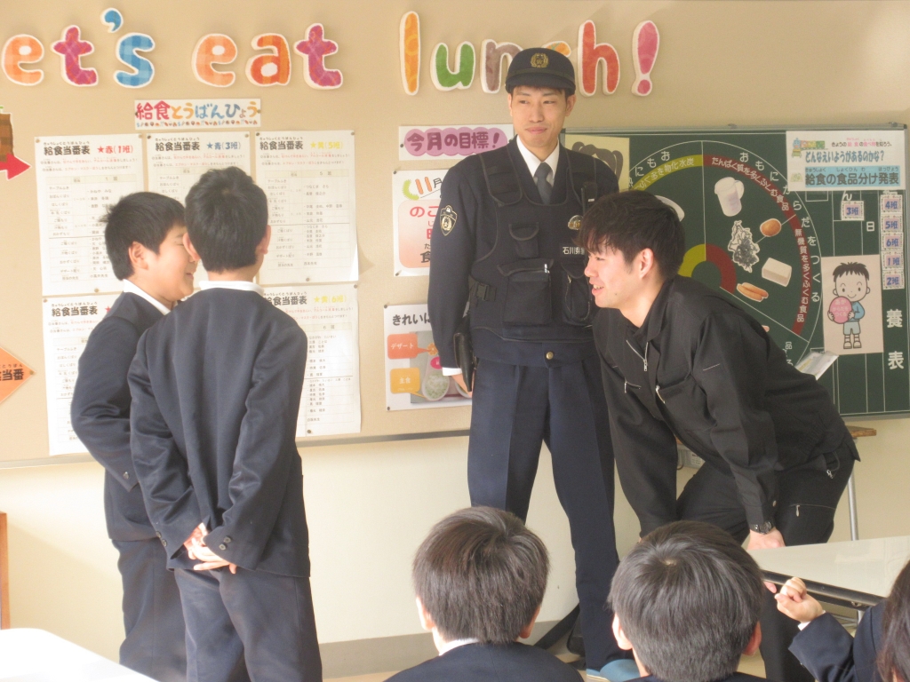 そのあと防犯教室が行われ,珠洲警察署のお巡りさんから不審者の特徴を大人の人に伝える方法や掴まれた時の対処方法について教えてもらいました。