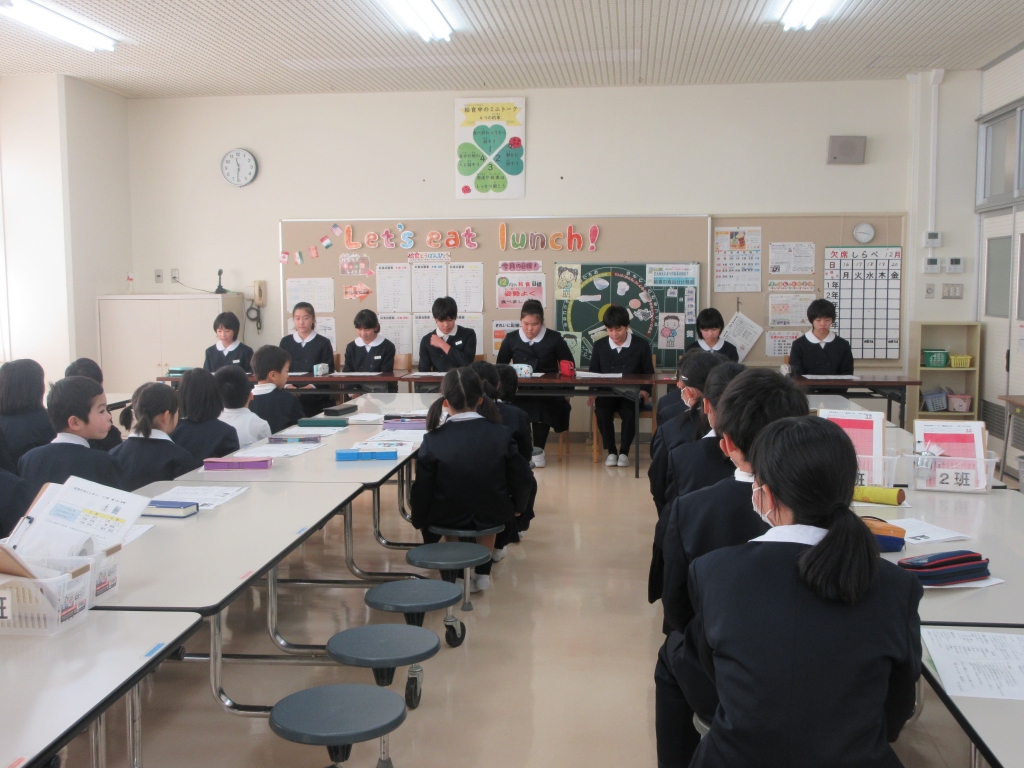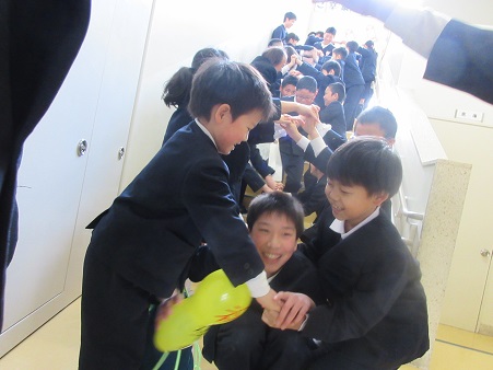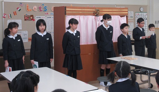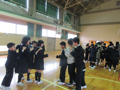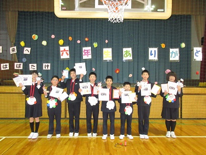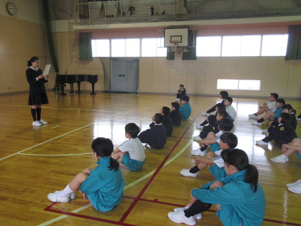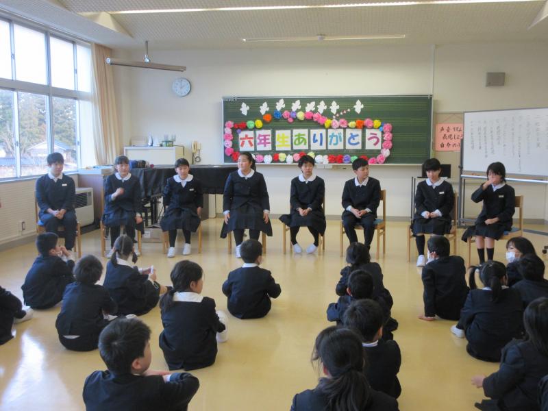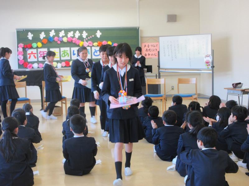 2月27日(木)に6年生を送る会がありました。司会進行は4・5年生が主体となり,6年生と楽しい時間を過ごしました。ジャンケン列車やジェスチャーゲームなど体を使ったゲームで盛り上がり,その後はプレゼント渡しがありました。6年生は1~5年生から手作りの素敵なプレゼントをもらい,6年生から下級生には,手作りキーホルダーと学校のタブレット端末を入れるバッグをもらいました。6年生にとっていい思い出になってくれればいいですね。