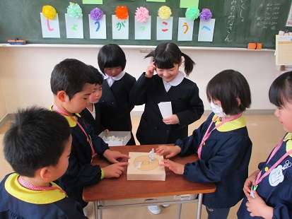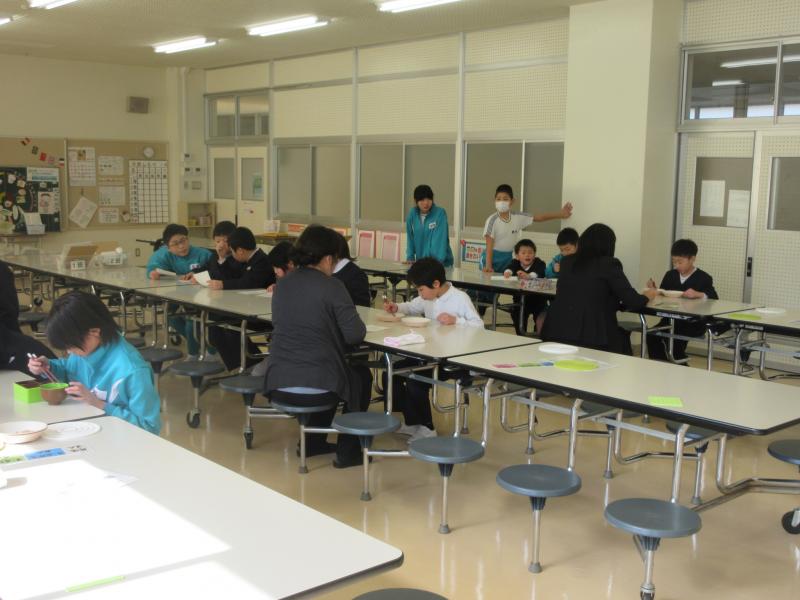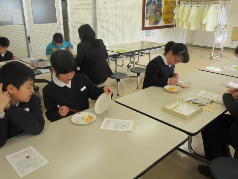 2月5日,10日,19日,26日の4日間のお昼休みにおはし検定が行われました。おはし検定では,ひよこ豆や大豆をおはしでつかみ,制限時間内に移動させることができるか挑戦しています。子どもたちは名人を目指して練習を重ね,根気よく挑戦していました。