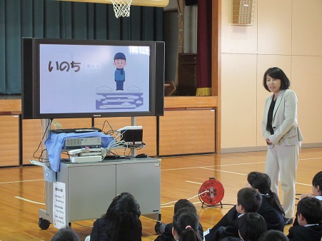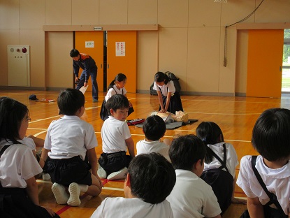 6月14日(木)授業参観後の6限目はAED講習会でした。珠洲消防署の方から2名の救急救命士の方に来ていただき,AEDの扱い方等の講習を受けました。保護者,職員,5・6年生が2名1組になって胸骨圧迫(心臓マッサージ)やAEDの操作を学びました。1~4年生はその様子を見学しました。