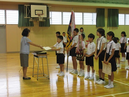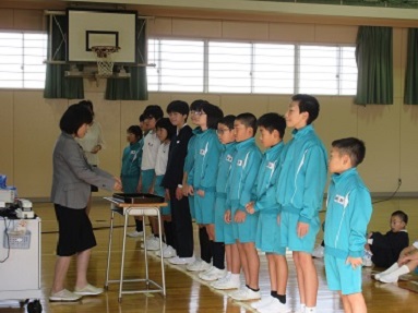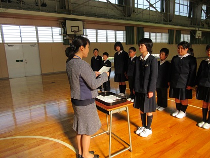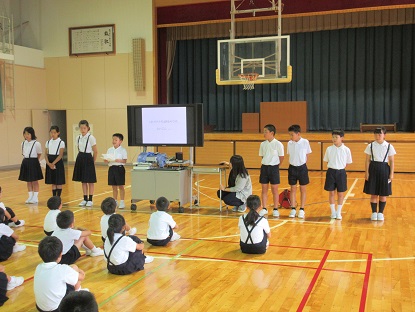 4月12日(木)全校集会で,前期児童会の役員や委員会の役員の任命式がおこなわれました。校長先生から任命証をいただいた後,「学校のためにがんばります,皆さんよろしくお願いします。」という決意を述べました。前期は運動会という大きな行事もあります。みんなで協力していってほしいと思います。