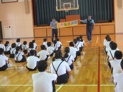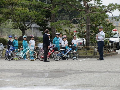 4月23日(月)3,4限目に全校で交通安全教室をおこないました。珠洲警察署のお巡りさんや,地域の若山っ子見守り隊,保護者の方のご協力で,正しい自転車の乗り方(3年生以上)や,正しい横断歩道のわたり方(1,2年生)を学びました。子どもたちは真剣にお話を聞き,実地練習に臨んでいました。GWが近づき,車が多くなることが予想されます。これからも交通安全に十分心がけていきたいと思います。