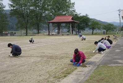 5月13日(日)早朝6時からPTA環境整備作業としまして,運動場の除草作業がおこなわれました。途中から小雨が降ってきたのですが,熱心に除草してくださったおかげで運動場がきれいになり,子どもたちの活動にもますます熱が入るのではないかと思われます。作業をしてくださったPTAの方々に感謝いたします。また,児童も数名参加しがんばって小石を拾ってくれました。運動会に向け,また一つ環境が整ったと思います。