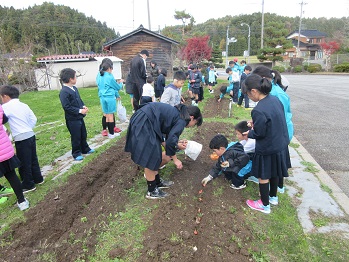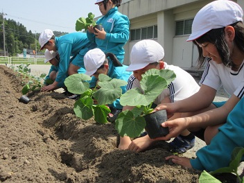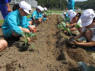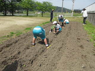 16日(水)農業委員の石尾さんのご指導の下,畑の苗植えをしました。植え方のお話を聞いた後,3・4年生はブロッコリーを,5年生はカボチャを,6年生は西瓜をそれぞれ植えました。収穫が楽しみです。が,そのためにはしっかりとお世話しなければなりません。水やりや草取りなど,これからがんばって大きく育てたいと思います。