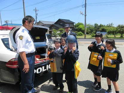 5月22日(火)は4年生の施設巡りでした。クリーンセンター(能登町)→浄水場→警察署→(昼食:わくわく広場)→消防署→浄化センターと見学してきました。警察署ではパトカーや白バイに乗ったり,消防署では防護マスクを身につけたりと普段経験できないようなことを体験し,みんな満足そうでした。関係施設の皆様,どうもありがとうございました。