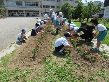 6月7日(木)全校児童で学校前の花壇にサルビアの苗を植えました。たて割り班に分かれて1年生から6年生まで全員が協力して花壇いっぱいに植えることができました。児童は,きれいな花が咲きますようにと心をこめて土を欠け,水を与えていました。きっと花壇とみんなの心に素敵な花が咲くと思います。