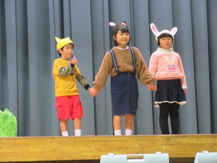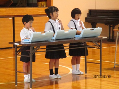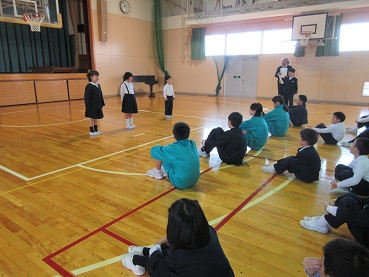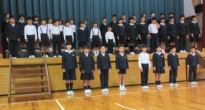 11月29日(木)朝の全校集会で,3・4年生の学習発表をしました。最初,リコーダーで「聖者の行進」を演奏し,次に「もみじ」を歌いました。1題めは高音部,2題めは低音部を歌い,時間差で合唱(?)をしました。