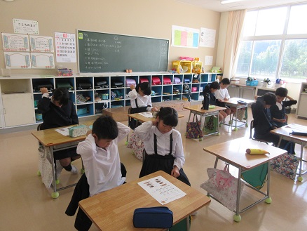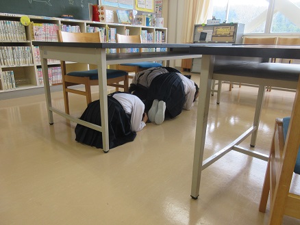 5日(水)午前,不審者が学校に侵入したという想定で避難訓練をおこないました。児童は犯人に気づかれないように身を隠し,息をひそめて不審者が去るのを待ちました。その後体育館で,今度は登下校中に不審者が現れたらどうすればいいのかを,体験しながら学びました。防犯ブザーを鳴らしたり,「助けて~!」と大きな声を発しながら,どの児童も真剣に取り組んでいました。ただ今日の訓練は,実際には生かされないのが最高ですね。