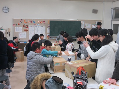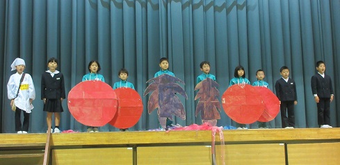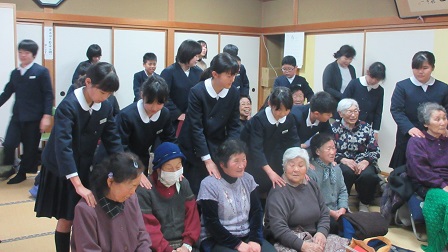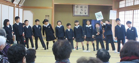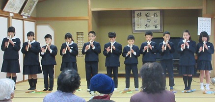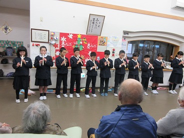 12月19日(水)午前,若山公民館でいっぷくかん交流をおこない,地域のお年寄りの方とふれあいました。低,中,高学年ごとに分かれ,歌や合奏,クイズや劇などを披露した後,肩もみをして和やかなひと時を過ごすことができました。