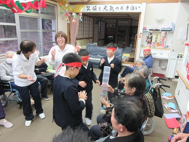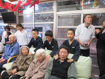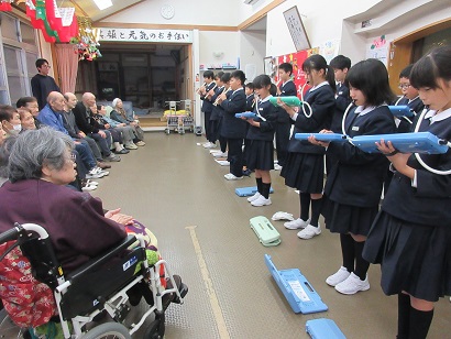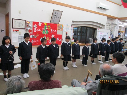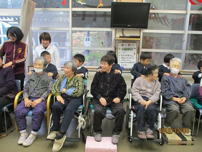 12月7日(金)午後,5・6年生がやまびこ訪問をしました。「キリマンジャロ」の演奏のあと「男の勲章」のダンス披露があり,とても盛り上がりました。肩もみはさすが高学年で,力加減をすることにより,とても気持ちのいいと好評でした。その後は恒例のゲームでこれまた盛り上がり,お年寄りの方々と楽しいひと時を共有することができました。