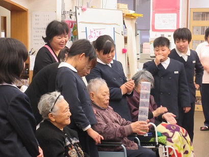 先日の3・4年生に続いて,6日(木)の午後は1・2年生がやまびこ訪問をおこないました。「むしのこえ」「ゆうやけ」の合唱(一部演奏付き),クイズをした後,おじいちゃんおばあちゃんの肩もみをしました。おじいちゃんおばあちゃんも,肩もみをしてもらい,気持ちよさそうでした。「ありがとね」と声をかけてくださって,児童もやってよかったなと笑顔になりました。最後に恒例(?)のボール落としゲームをして盛り上がりました。とても楽しい交流ができたと思います。