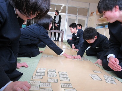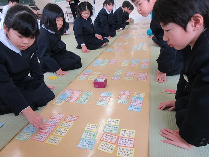 1月10日(木)午後,全校児童が参加して校内百人一首大会がおこなわれました。低学年も初めのうちはなかなか探せなかったけれど,自分の得意札が読まれると上の句のうちに元気よく「ハイ!」という声が会場に響きました。高学年は,始めから上の句対戦が多く,素早い動きで札をとりあう姿がみられました。どの児童も,1枚でも多くとろうと必死でがんばっていました。