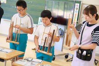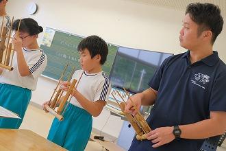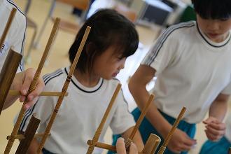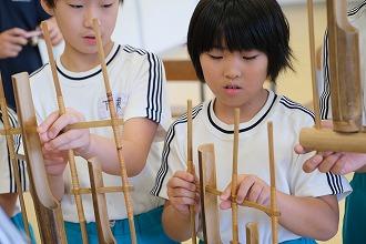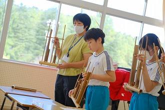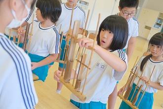 9月30日(火)、アンクルンという楽器を演奏してみました。今回は先生方も一緒に参加!アンクルンはインドネシアの楽器で、中心部を持って下の部分を揺らすと何とも言えない柔らかな音色がします。ハンドベルに似ていて、それぞれにド・レ・ミ…の音が出るようになっています。「さくら」「ゆうやけこやけ」に挑戦してみました。短い時間でしたが練習をしていくたびに心が一つになっていくように感じました。