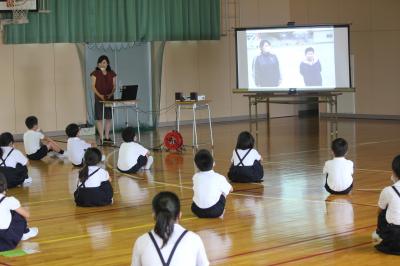 続いて、防犯教室が行われました。不審者に出会ったときにどう対応すればよいのかなどを学びました。あってほしくはないですが、いざという時に、今日の学習が生きるといいですね。