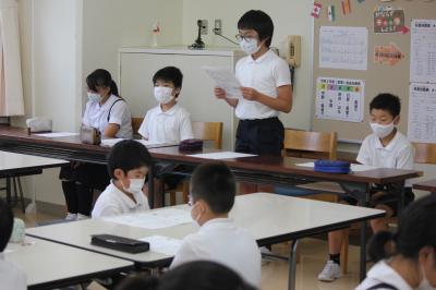 6年生が中心となり、「夏休みの生活」について話し合いました。自転車の乗り方や遊びのルールについて質問が出るなど、長いお休みの過ごし方について、みんなで真剣に話し合うことができました。