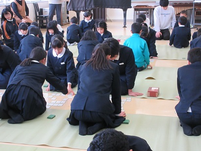 1月10日(木)午後,全校児童が参加して校内百人一首大会がおこなわれました。低学年も初めのうちはなかなか探せなかったけれど,自分の得意札が読まれると上の句のうちに元気よく「ハイ!」という声が会場に響きました。高学年は,始めから上の句対戦が多く,素早い動きで札をとりあう姿がみられました。どの児童も,1枚でも多くとろうと必死でがんばっていました。