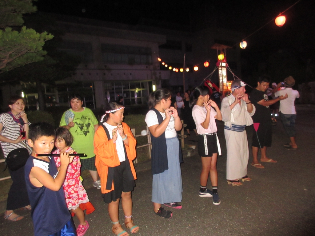 8月14日(水)午後7時から,第14回子どもキリコと盆踊りの夕べが行われました。子どもたちは,お米ありがとう音頭・珠洲音頭・ちょんがり節を踊りました。運動会・庭祭り以来でしたが,みんな上手に踊っていました。3・4年生のキリコは,5・6年生の笛・太鼓に合わせて,櫓の周りを元気よく練り歩きました。子どもたちは,保護者・地域の方々とふれあい,とても楽しい時間を過ごしました。