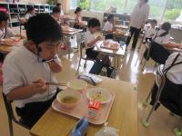 続いて、給食の時間には、「かむかむセンサー」という機械を装着し、かむ回数を確かめながら食事をしました。かんだ回数がモニターにすぐに表示れるので、よくかむことを意識しながら食べることができました。これからも、よくかんで食事をとりたいですね。