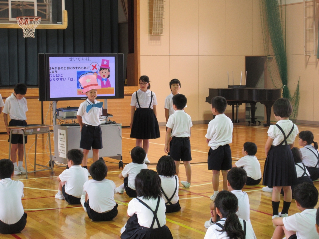 歯と口の健康 投稿日時 : 2019/07/17 システム担当 7月の全校集会で保健委員会が歯と口の健康について発表しました。クイズをだしたり、学年ごとにどんな勉強をしたのかを紹介したりしました。堂々とした発表で大変わかりやすく、楽しみながら健康について考えることができました。「歯と口をこれからも大切にしたい」という感想が多く聞かれました。 {{options.likeCount}} {{options.likeCount}}