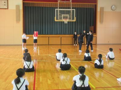 そして、代表委員会から、「ソーシャルディスタンス」について、お芝居を交えながら説明がありました。「鬼ごっこでタッチ!」「バスケットのゴールを決めてハイタッチ!」「整列のときにくっつく」など、ソーシャルディスタンスが守られていない集を、わかりやすく教えてもらいました。