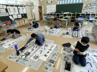 つづいて、各教室に分かれて書初め大会が行われました。堂々とした立派な作品に仕上がりました。作品は玄関に掲示してあります。