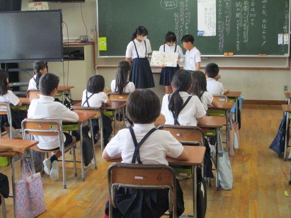 朝の時間を使って、図書委員会のメンバーが1~3年生に読み聞かせをしました。楽しんでもらえるようにと、よく考えて本を選び読む練習も頑張ったので、みんな注目して聞いていました。