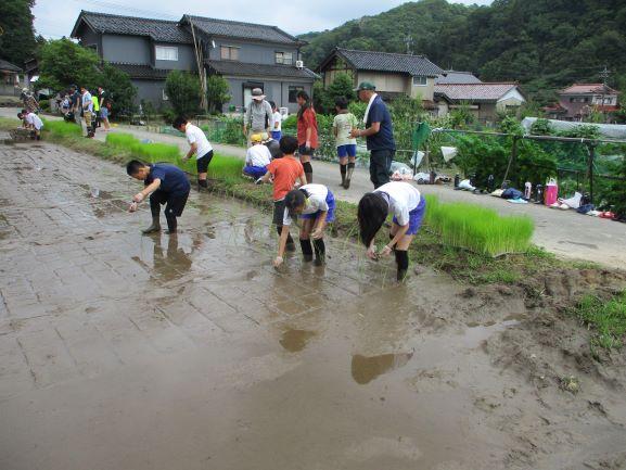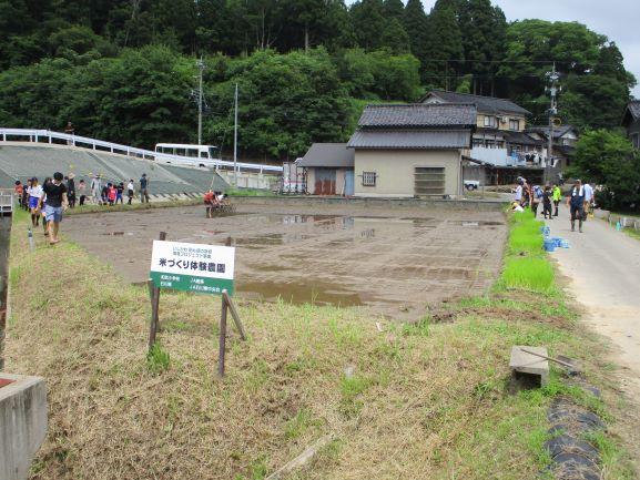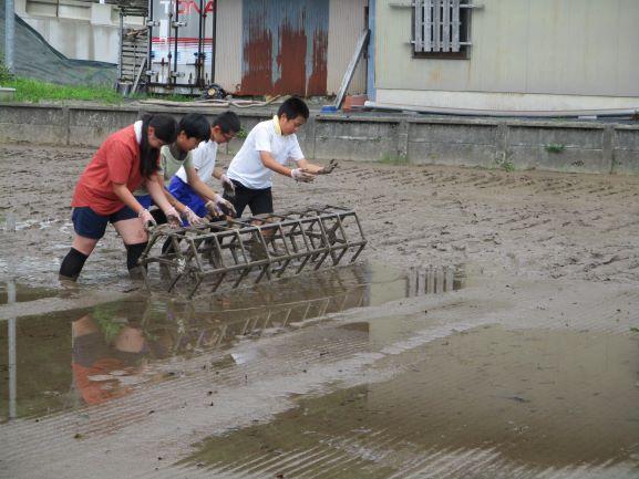 6年生の田植え体験が行われ、金剛寺町の田んぼでもち米の苗を植えました。いつもお世話になっている杉元さんをはじめ、JAの方、学校運営協議会の方など、多くの方々にお手伝いいただきました。子供たちは、枠転がしや苗植えの難しさを感じながらも、頑張って取り組んでいました。