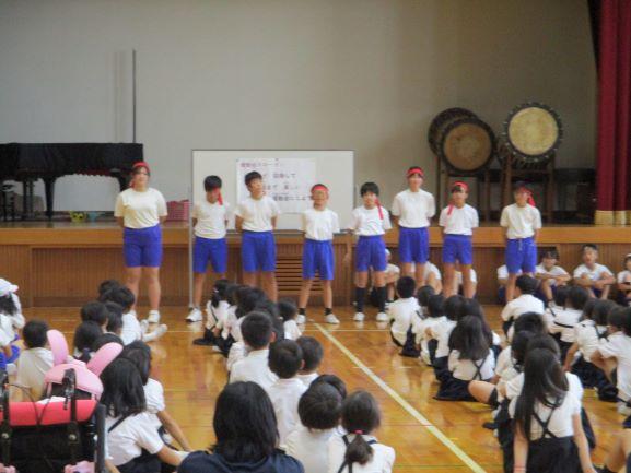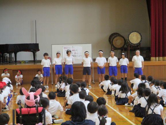 やまびこ集会が開かれ運動会の結団式が行われました。運動会のスローガンの発表と赤白各応援団の紹介がありました。今年のスローガンは「みんなで協働して 最後まで楽しい運動会にしよう」です。運動会に向けて、これから頑張ろうという気持ちが高まっていました。
