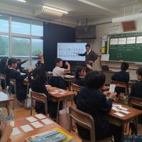 5年生の社会科の授業に、能美市産業企画部長の中川様をお招きして、能美市の工業・工場・企業のことについて学習しました。スライド資料を見ながら、和光台の住宅地や加賀産業道路が整備され、市内に多くの企業があることで、税収が増え、安心安全の街づくりが進んでいることを知ることができました。働くところを用意して人が集まることで町が元気になることを教わり、中川部長様からは「皆さんも能美市に誇りと愛着をもって、能美市が魅力あふれる地域となるよう一緒に頑張りましょう」というメッセージをいただきました。子どもたちからは「知らないことがたくさんあった。税金はいろんなことに使われていて自分たちは幸せだなと思った」「能美市はすごい。町を元気にするために中川さんやいろいろな方が協力していることがすごいなと思った」など感想を述べていました。「能美市、最高!」とつぶやきながら次の授業へ向かう子もいました。中川部長様はじめ産業企画部の皆様、誠にありがとうございました。