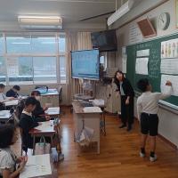 4年生が社会科の時間に、地域の宝の一つ遣水観音山と霊水堂について学習しました。霊水堂は30年前に整備され、その後も仏大寺町の皆さんにより大切に守られている場所です。今日は、講師として仏大寺町の表さんと畑中さんにお越しいただき、遣水観音山・霊水堂の歴史や、霊水堂の保全活動についてお話しいただきました。子どもたちにとっては、遠足や町探検で度々訪れている場所ではありますが、スライドを使って詳しく教えていただいたおかげで、今回新しく知ることもあり、みんな熱心にメモをとっていました。表さん、畑中さん、ありがとうございました。