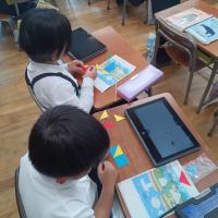 今日はふれあい教室に、たくさんのコーナーを設け、1年生を招待して、自分たちの作ったおもちゃで遊んでもらう企画を行いました。名付けて「おもちゃランド」。お店の担当もちろん2年生です。「いらっしゃいませー」と呼び声をかけて、自分たちのおもちゃを楽しんでもらおうと一生懸命。1年生の子どもたちは、「ビー玉落とし」「水の色の変わるマジック」「魚釣り」「玉パクリ」「グライダー」など全部で12のコーナーを順番に回り、とても楽しそうでした。2年生たちも満足そうな笑顔がたくさん咲いていました。
