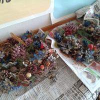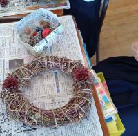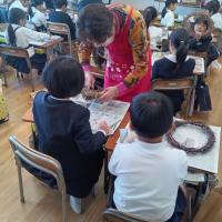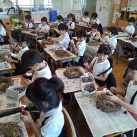 先日、辰口地区より講師を招いて、1年生が朝顔のリース作りをしました。子どもたちは、1学期に育てた朝顔を夏休みに家庭に持って帰っていましたが、その朝顔のつるを乾燥させリースの土台にしたものを学校に持ってきて、飾りつけをしました。講師の谷川先生が、さまざまな色のついた松ぼっくりや木の実などを持ってきてくださったので、子どもたちは大変喜んで思い思いに飾りつけ、素敵な作品に仕上げていました。谷川先生、お世話になりありがとうございました。