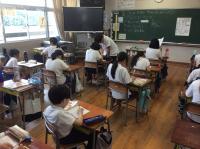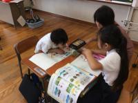 1年生は、生活科の授業で、学校の隣にある里山公園へ行き、虫取りをしてきました。虫かごに入れた鈴虫やバッタをよく観察して絵にしていました。みんな、真剣に細かいところまでよく観察して描いていました。虫のことを図鑑で調べて特長を教えてくれる子もいました。