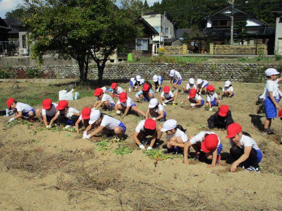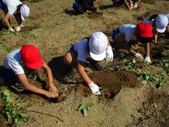 1,2年生が、5月に植えたさつまいものいもほりをしました。子供たちはおいもを見つけようと一生懸命に土を掘り、見つけたいもを傷つけないように気を付けながら収穫していました。