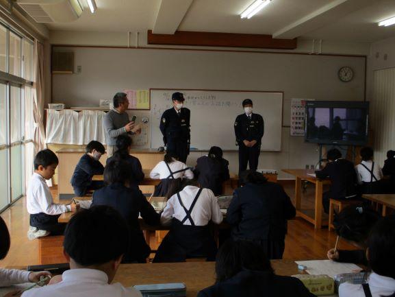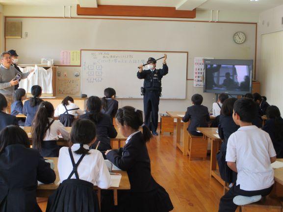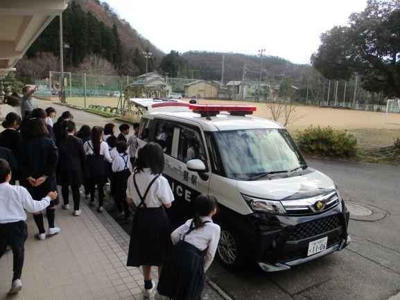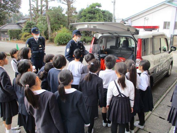 能美警察署辰口交番から2名の方をお迎えし、3年生の出前授業が行われました。まず、子供たちからの質問に答えていただき、警棒などの携帯品を実際に見せてもらいました。次に、パトカーの中も見せていただき、装備品などを説明してもらいました。警察の方の仕事について詳しく知ることができ、とても良い勉強になりました。
