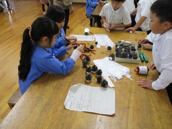1年生が国造保育園の年長組の皆さんを招待して、「あきとなかよしまつり」を行いました。生活科で勉強したことを生かし、秋の木の実や葉っぱなどを使い、ゲームや物づくりを楽しむお店を開きました。年長さんも1年生も、みんながわくわくした気持ちで楽しく笑顔でできました。