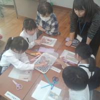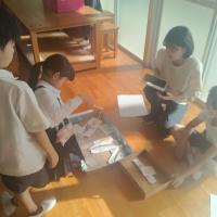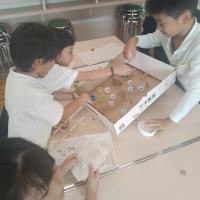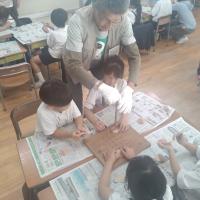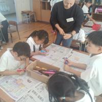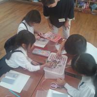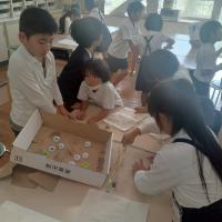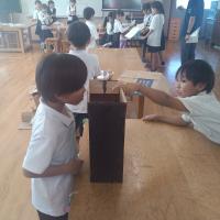 今日はふれあい教室に、たくさんのコーナーを設け、1年生を招待して、自分たちの作ったおもちゃで遊んでもらう企画を行いました。名付けて「おもちゃランド」。お店の担当もちろん2年生です。「いらっしゃいませー」と呼び声をかけて、自分たちのおもちゃを楽しんでもらおうと一生懸命。1年生の子どもたちは、「ビー玉落とし」「水の色の変わるマジック」「魚釣り」「玉パクリ」「グライダー」など全部で12のコーナーを順番に回り、とても楽しそうでした。2年生たちも満足そうな笑顔がたくさん咲いていました。