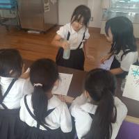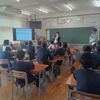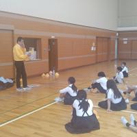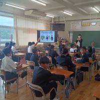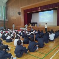 訓練当日は、放送の合図で、まず3階の教室や特別教室に全員が避難し、人数確認を行いました。その後、全員体育館へ集合し、石川県南加賀土木総合事務所の方に、土砂災害の種類や避難方法等について動画も交えながら教えていただきました。