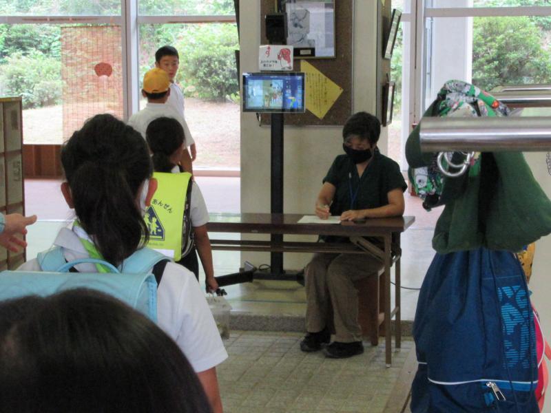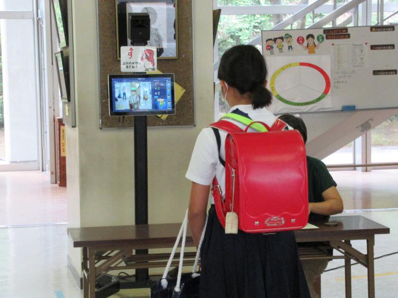 9月より、サーモグラフィーカメラによる登校時の検温を開始しました。玄関での消毒の後、きちんと整列して順番を待ち、学年と名前をはっきり言って検温を行います。表示された体温を確認し、「教室に入りましょう」の音声を聞いて教室に向かいます。