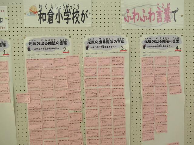 友だちや仲間に言われてうれしかった「ふわふわ言葉」の紹介をしています。「がんばれ」や「いっしょに遊ぼう」の他に、「手伝うよ」「あっ、そういうことあるよね」「ごめんね」などの言葉が紹介されています。玄関ロビーに掲示していますが、掲示板がいっぱいになりそうです。和倉小学校が「ふわふわ言葉」であふれるとうれしいですね。