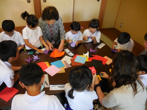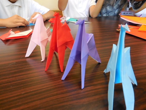 こんばんは。今日は,おりがみ教室が開催されました。講師は,「なごまんかいね」のみなさんでアクロバットホースの作り方を教えていただきました。後ろのしっぽを引っ掛けて,くるっと1回転する様子がとてもかっこよく,みんな何度もくるくると回転させて遊んでいました。とても和やかな時間をすごし,うれしそうに作った折り紙を持ち帰りました。また作って遊んでみてくださいね。