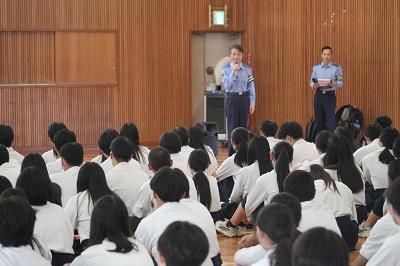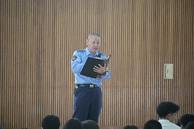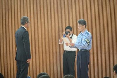 認定式では、警察本部交通部の方から「ヘルメット着用の大切さ」についてお話をいただき、本校がヘルメット推進校として認定されました。